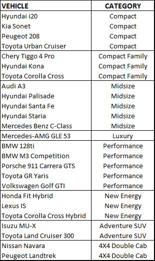 Besides the overall winner’s crown, finalists can also win one of ten categories: Budget, Compact, Compact Family, Midsize, Premium, Luxury, Performance, New Energy, Adventure SUV and 4X4 Double Cab. The first category, Budget, has no contenders this year.
