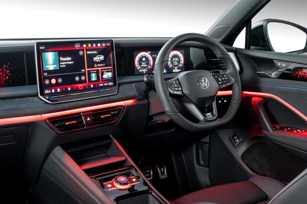 Tayron Life – everything on board. The all-new Tayron will launch with three equipment lines: Tayron Base, Life and R-Line. The 5-seater Base derivative offers Eco LED headlights, Park Assist, Blind spot monitor with rear traffic alert, 12.9-inch infotainment Radio, Adaptive cruise control with front assist, Lane keeping assist including 18-inch Bologna alloy wheels. The Tayron Life comes standard with an extensive equipment package. Among the features on board are a three-zone automatic air conditioner, 10-colour background lighting, nine airbags, driving experience control (which adjusts driving profiles), an infotainment system with App-Connect Wireless (for Apple CarPlay and Android Auto). The Life derivative also includes digital instruments, LED headlights with automatic main beam control (Light Assist), illuminated Volkswagen logos at the front and rear.