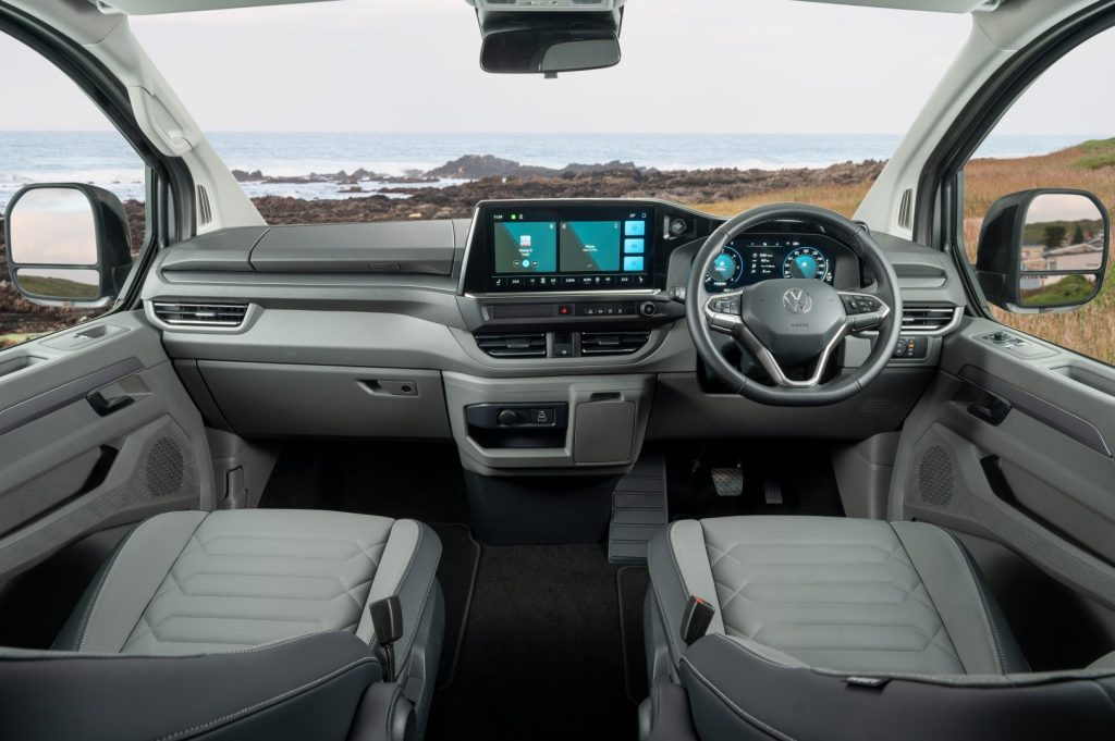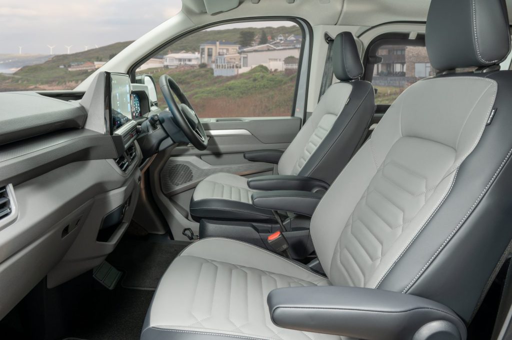 Ergonomic workplace: Volkswagen Commercial Vehicles has designed the driver’s workplace to be a professional and flexible work environment. The seats have a particularly ergonomic design. The spectrum here ranges from the four-way seat in the base versions to the optional individual seats with electric eight-way adjustment (front passenger: six-way) and four-way lumbar adjustment. The new cockpit landscape is arranged on an axis that is easy for the driver to see. It consists of 12-inch digital instruments (Digital Cockpit with 30-cm diagonal) and the 13-inch touchscreen (33-cm diagonal) of the infotainment system.