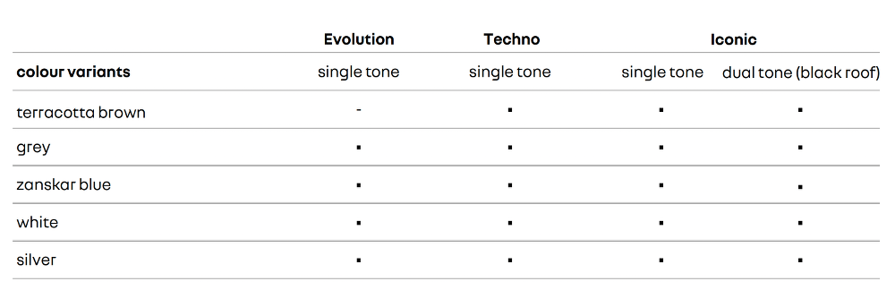 Product offering: Available in three distinct variants – Evolution, Techno, and Iconic, with three new colour options – Zanskar Blue, Grey and Terracotta Brown -alongside existing colours.